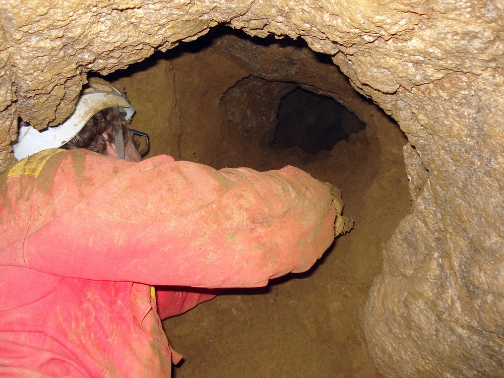 Začal jsem kopat pod stropem více vpravo – v kapse, kterou jsem si připravil v sobotu. Značně mě povzbudilo sondování roxorem, kdy jsem ve směru šikmo vpravo a vzhůru nenarazil na kámen. Po odtěžení dalších lóden a stržení stropu v tomto prostoru jsm si všiml, že se odsazení sedimentu začíná zvětšovat. Nasadil jsem nejvyšší bádací tempo, kdy jsem rezignoval na plnění lóden a jejich odesílání po dráze. Při sondování kladl materiál čím dál menší odpor – to už mi bylo jasné, že se blížím k volné dutině. Pomocí roxoru jsem nabíral horní vrstvu sedimentu a shazoval jej na sebe do síňky. Po sloupnutí asi decimetru sedimentů se přede mnou začal rýsovat otvor, kterým jsem dohléhl na kamennou stěnu, vzdálenou asi 2 metry.