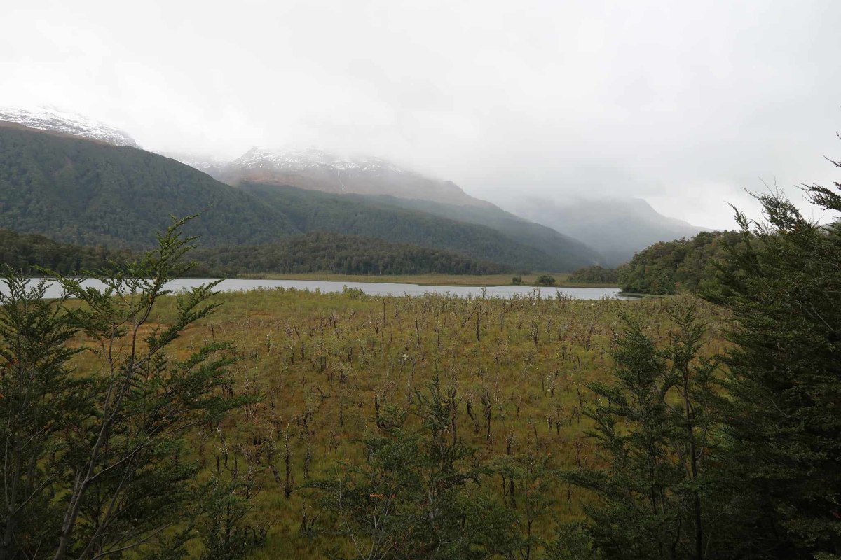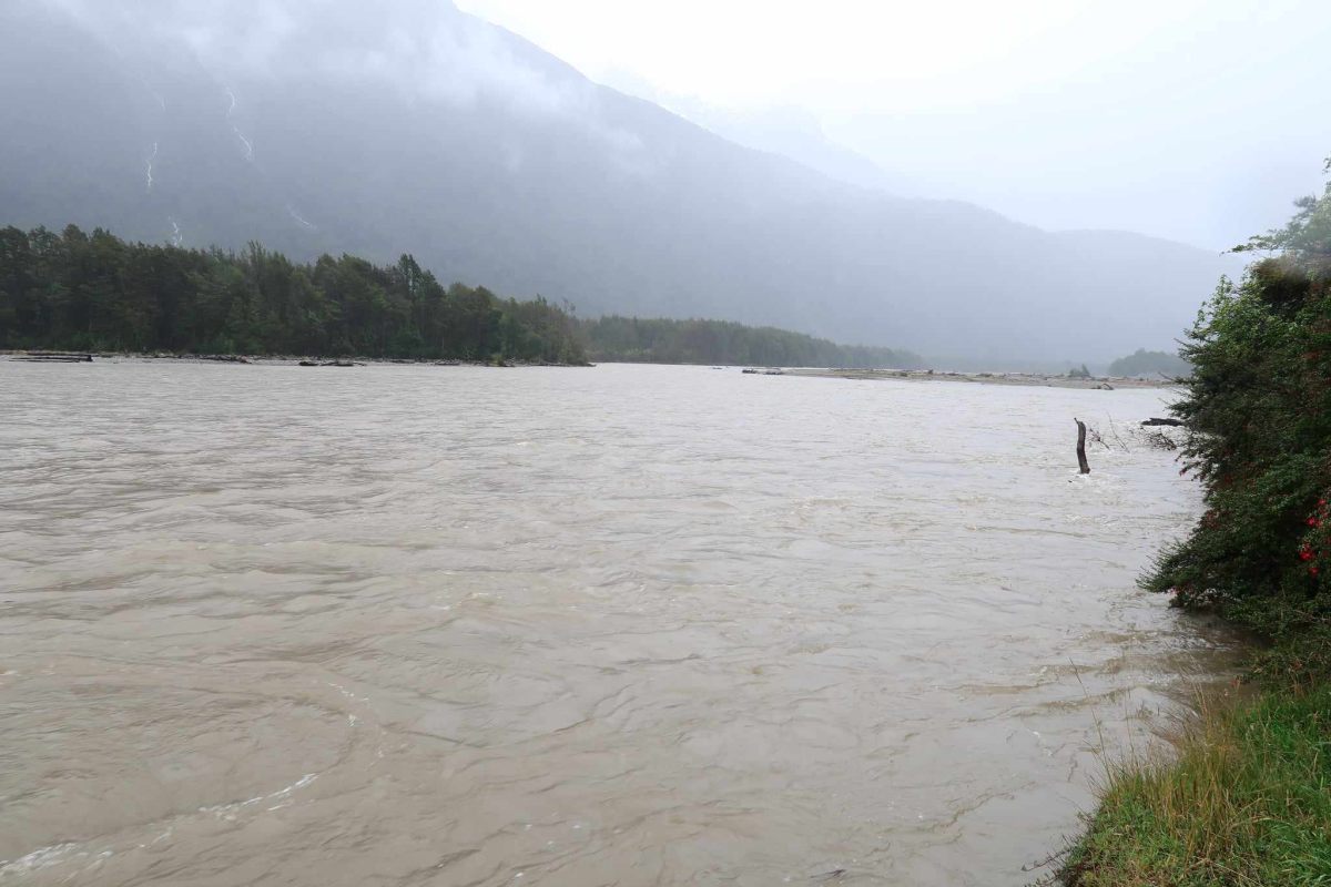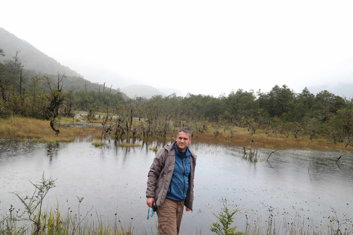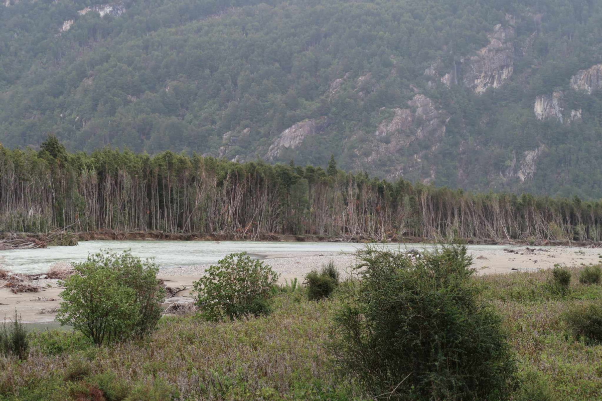 Pomalou jízdou jsem se sunul ke svému cíli. Po cestě byly dechberoucí výhledy. Rozervané zasněžené hory a rozlité široké řeky, v kterých byl les bažinou. Naprostá nádhera. Samotná cca 100 km cesta zabrala dalších pět hodin. Jel jsem pomalu a skoro pořád zastavoval u ikonických výhledů. Občas cestu vzala řeka nebo se na ní sesunul celý svah. Kupodivu tam ale hned byli cestáři a hned daný úsek opravovali. Jen se muselo čekat na uvolnění cesty. V podvečer na mě vykoukla tyrkysově modrá hladina jezera. Hloubka dosahuje úctyhodných 586 m. Jelikož pořád pršelo a strašně fučelo, hledal jsem kemp. Podařilo se najít jeden kousek od břehu jezera, kde to vypadalo jak u nás na Ponoru. Otevřená kuchyň se stolem na sednutí stlučený z kmenů stromů a polepená sololitem. Společnost mě dělal starší manželský pár ze Santiaga, který už dva týdny cestuje Patagonií. Sice uměli jen trošku anglicky, ale hezky jsme si povykládali a zkonzumovali zbytky vína a piva. Dokonce se stavil i majitel kempu, který mě zkasíroval o 10 tisíc pesos.